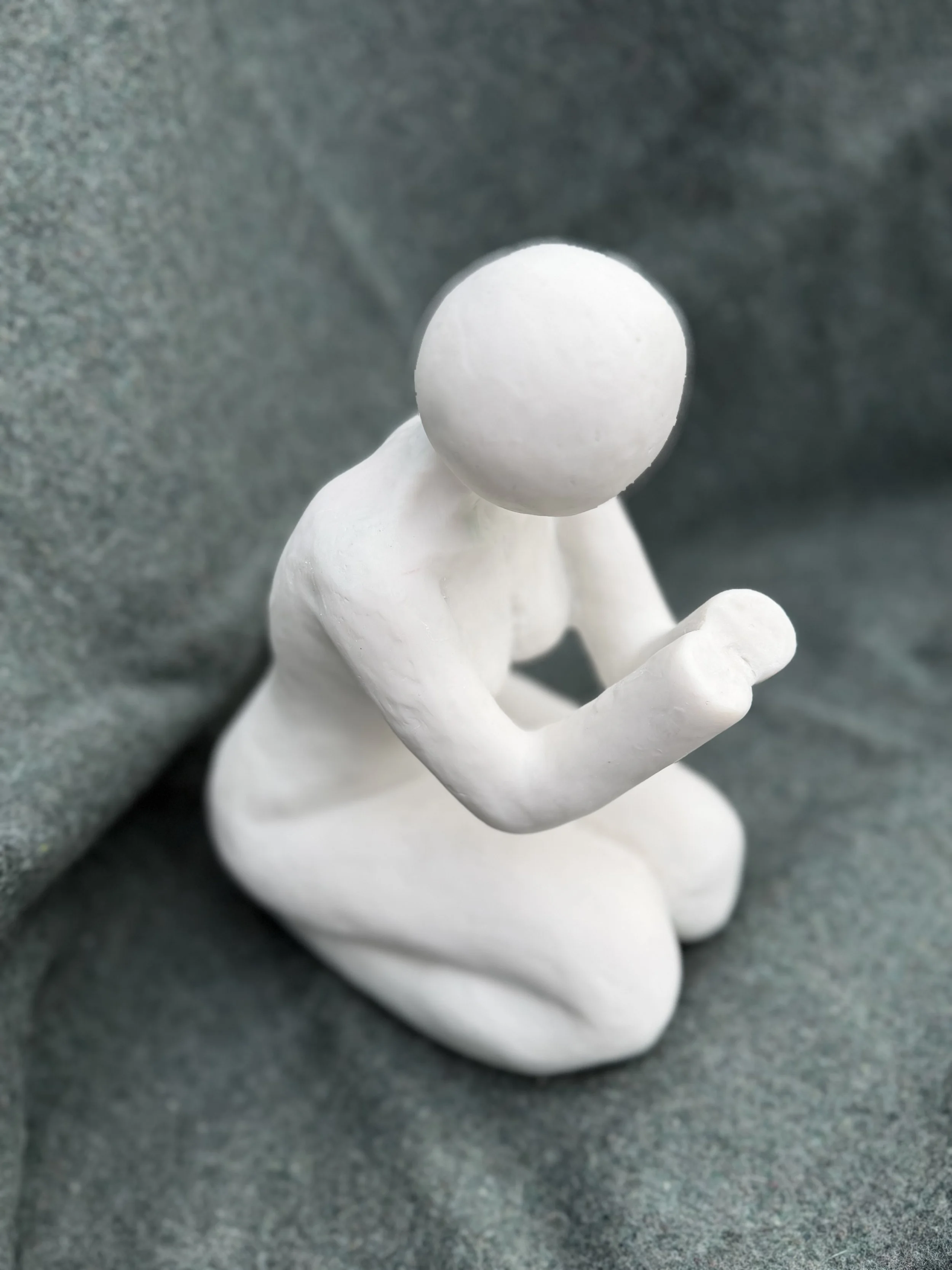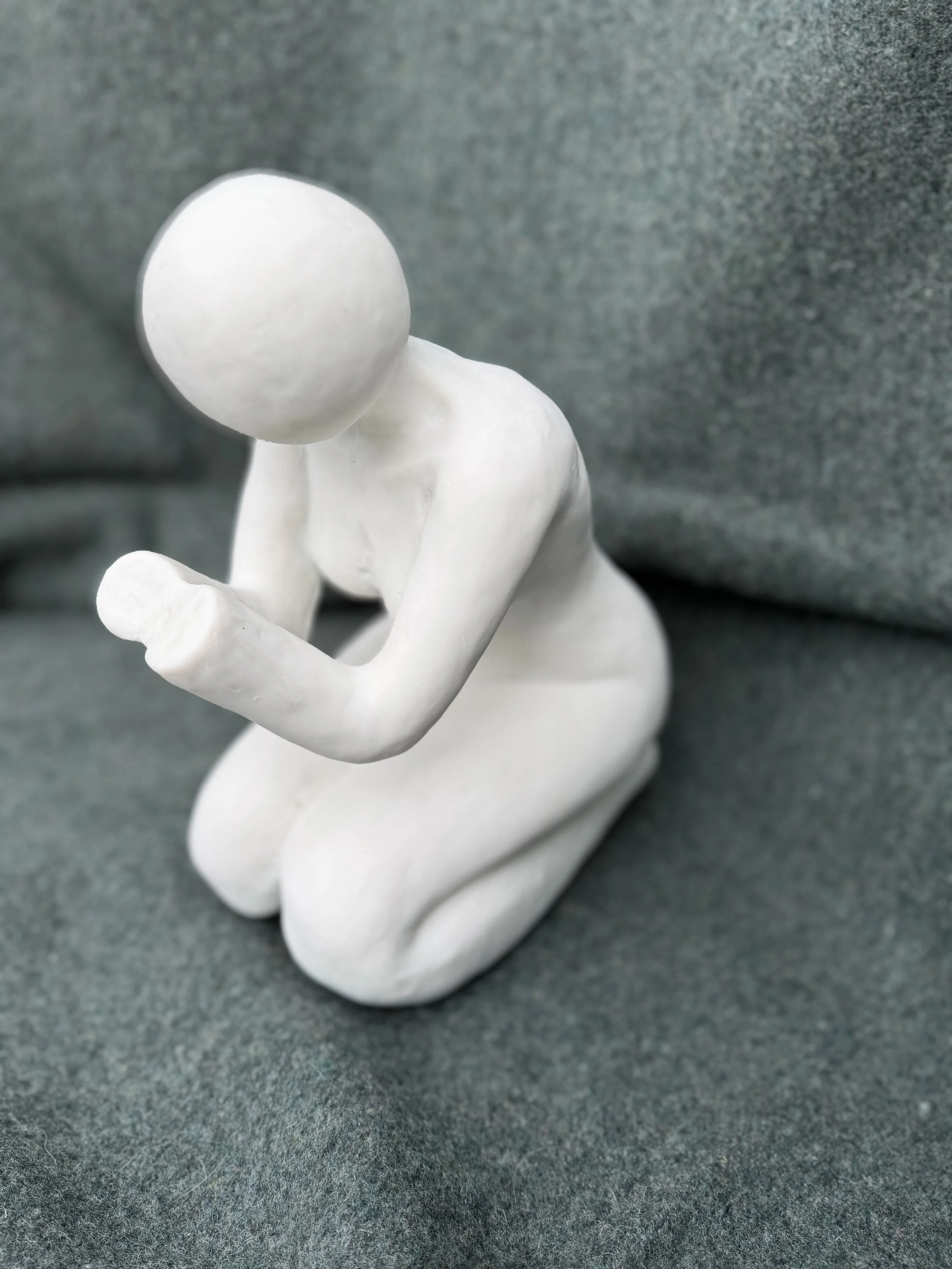 “She Rests Heavy” captures the quiet strength of a woman in stillness—arms and head resting on her legs in a moment of surrender and contemplation. This abstract yet expressive piece explores the weight we carry within, offering a tangible reflection of resilience and release.